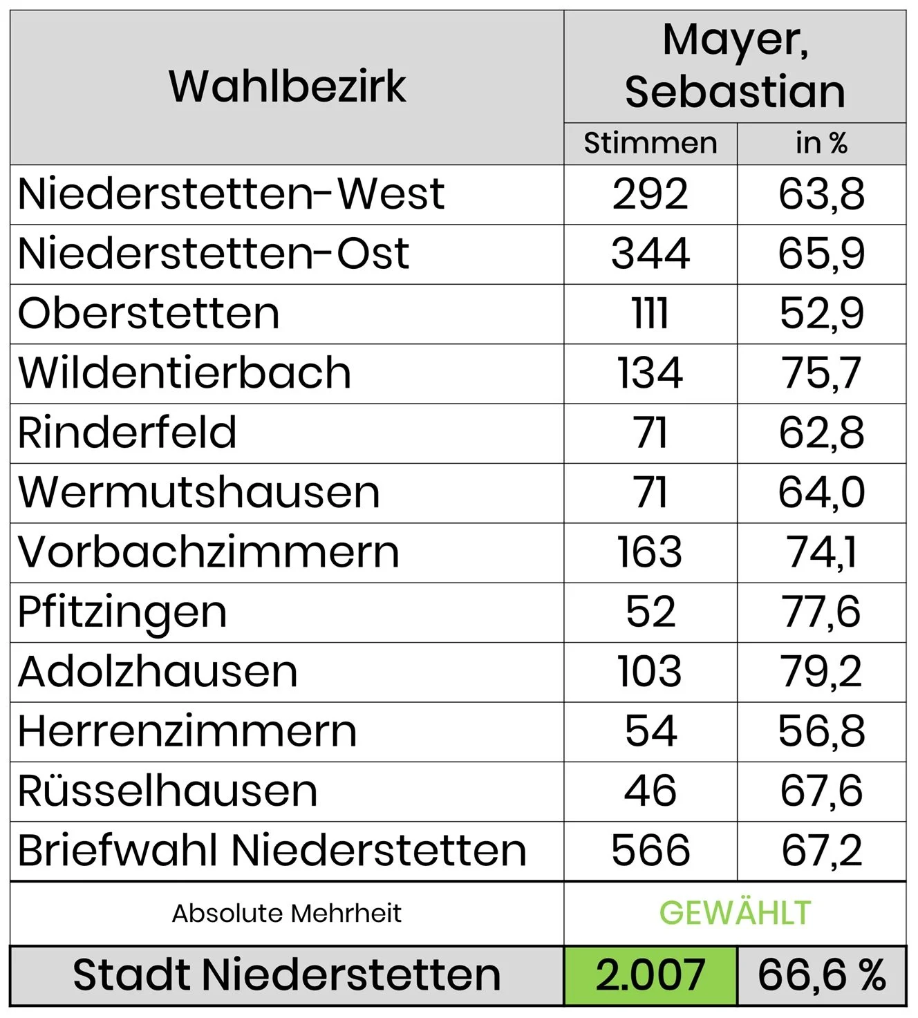 *Vorläufiges Ergebnis, Stand: 09.03.2026 - Mehr Informationen zum Wahlergebnis finden Sie auf der Homepage der Stadt Niederstetten (Link führt zur Wahlseite von Komm.ONE.)